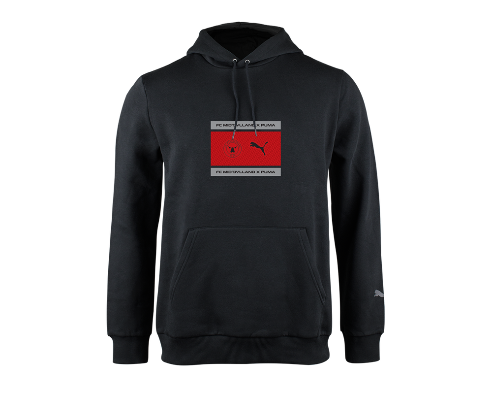 Denne hoodie er lavet af en let bomuldsblanding som sørger for at du føler dig godt tilpas hele dagen og kombinerer komfort med stil. Du kan bruge denne hoodie til enhver lejlighed, uanset om du er på vej til træning, slapper af derhjemme eller er på vej til MCH Arena. Denne specifikke variant kommer med teksten FC MIDTJYLLAND X PUMA og logoerne i en rød firkant.