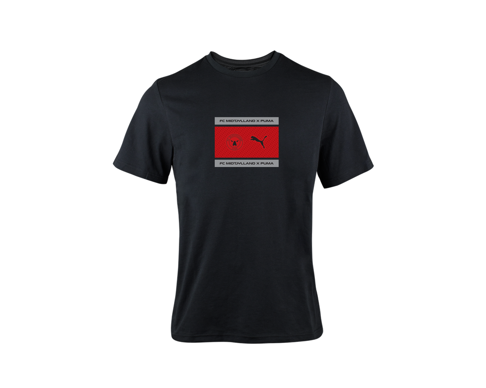 Denne t-shirt er lavet af en behagelig og blød bomuldsblanding med komforten i højsædet. T-shirten er lavet af en klassisk sort t-shirt med en rund hals og det enkle og stilrene design gør du kan bruge denne t-shirt til enhver lejlighed. Denne specifikke variant kommer med teksten FC MIDTJYLLAND X PUMA og logoerne i en rød firkant.