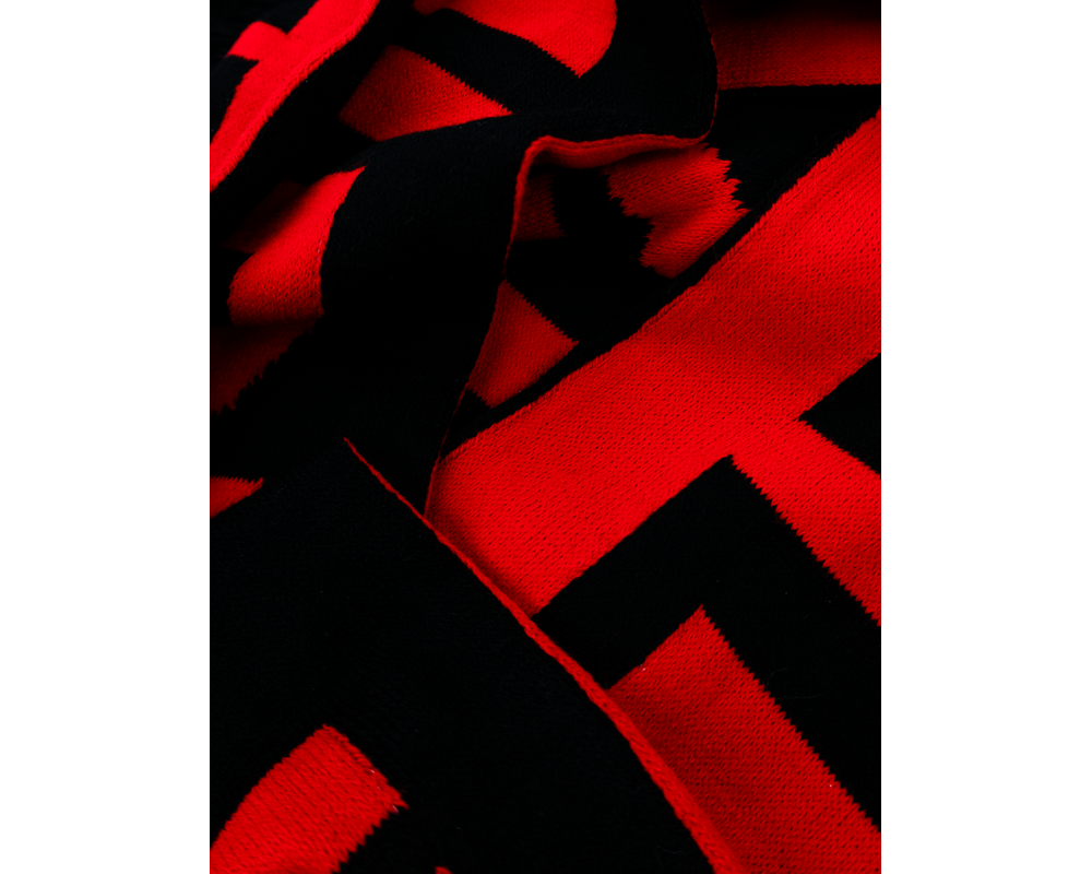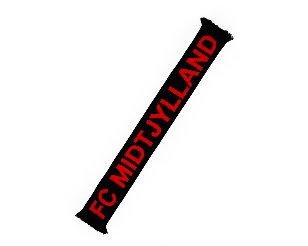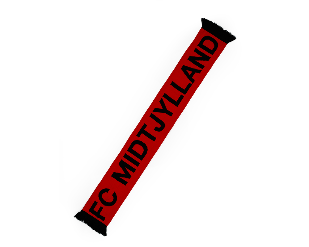 FCM halstørklæde i de klassiske røde og sorte farver med teksten "FC Midtjylland" henover.