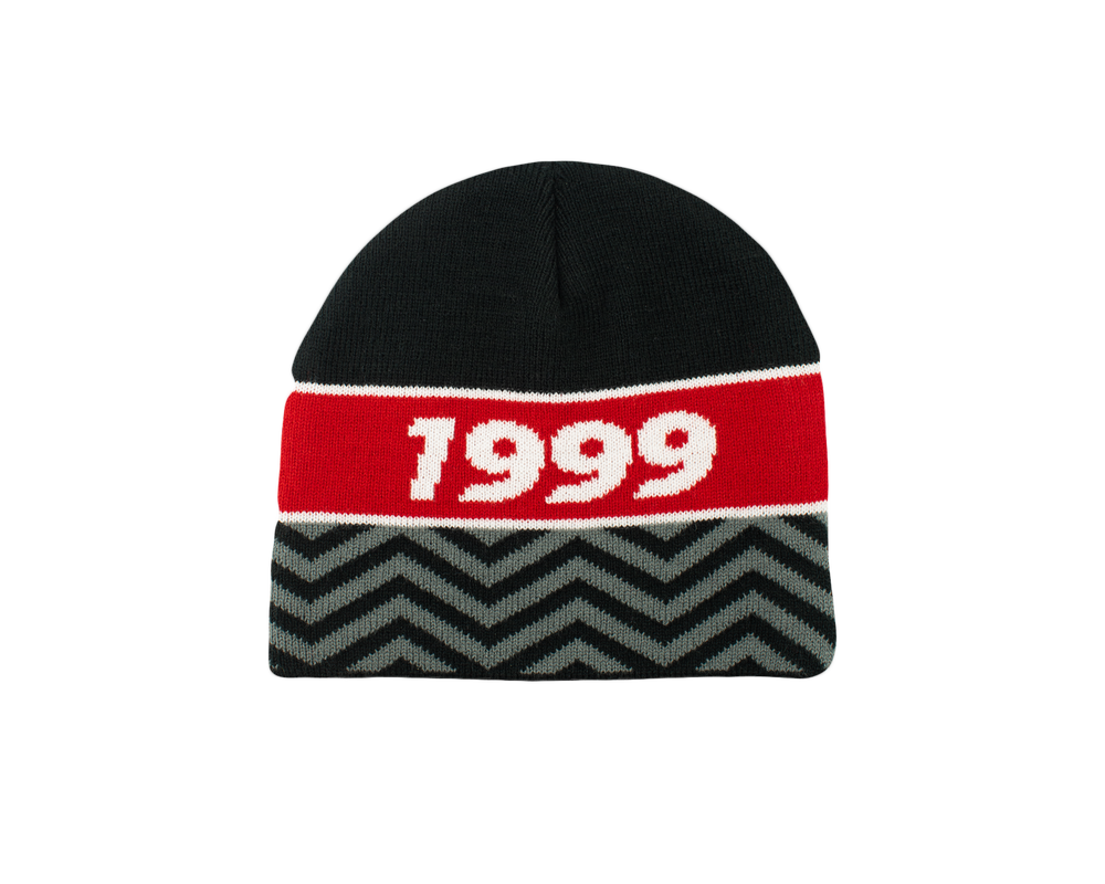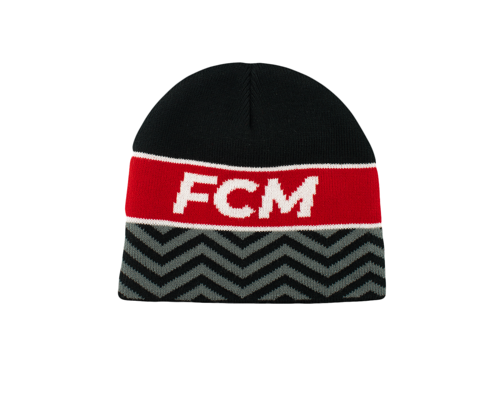 FCM-hue med teksten FCM på den ene side og 1999 på den anden. En flot hue i sort, rød og hvid farve, samt et gråt mønster.