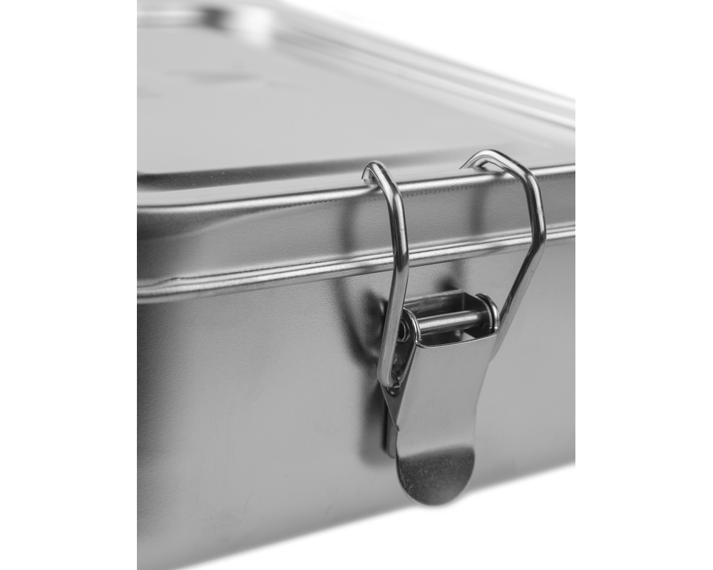 Den nye FCM Madkasse i stål i stor udgave er den perfekte løsning til både børn og voksne, der skal have mad med på farten. Med sin holdbare stålstruktur og det flotte ulve-logo, kombinerer den funktionalitet med stil. Den har en praktisk låsemekanisme, der sikrer, at låget sidder tæt og holder maden frisk hele dagen.