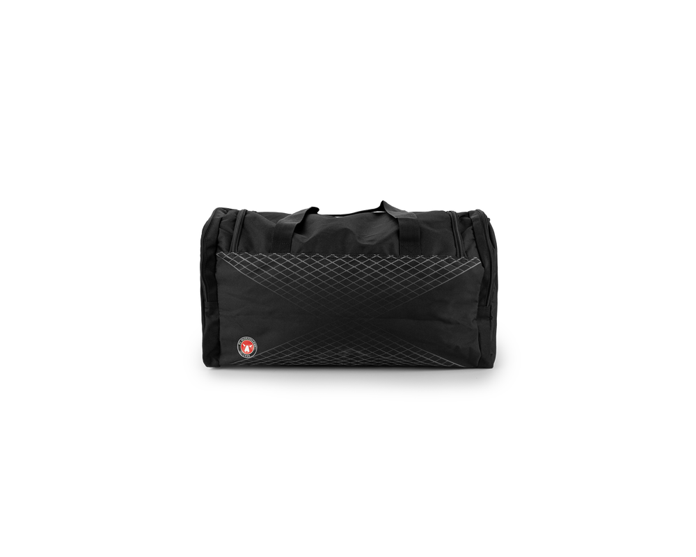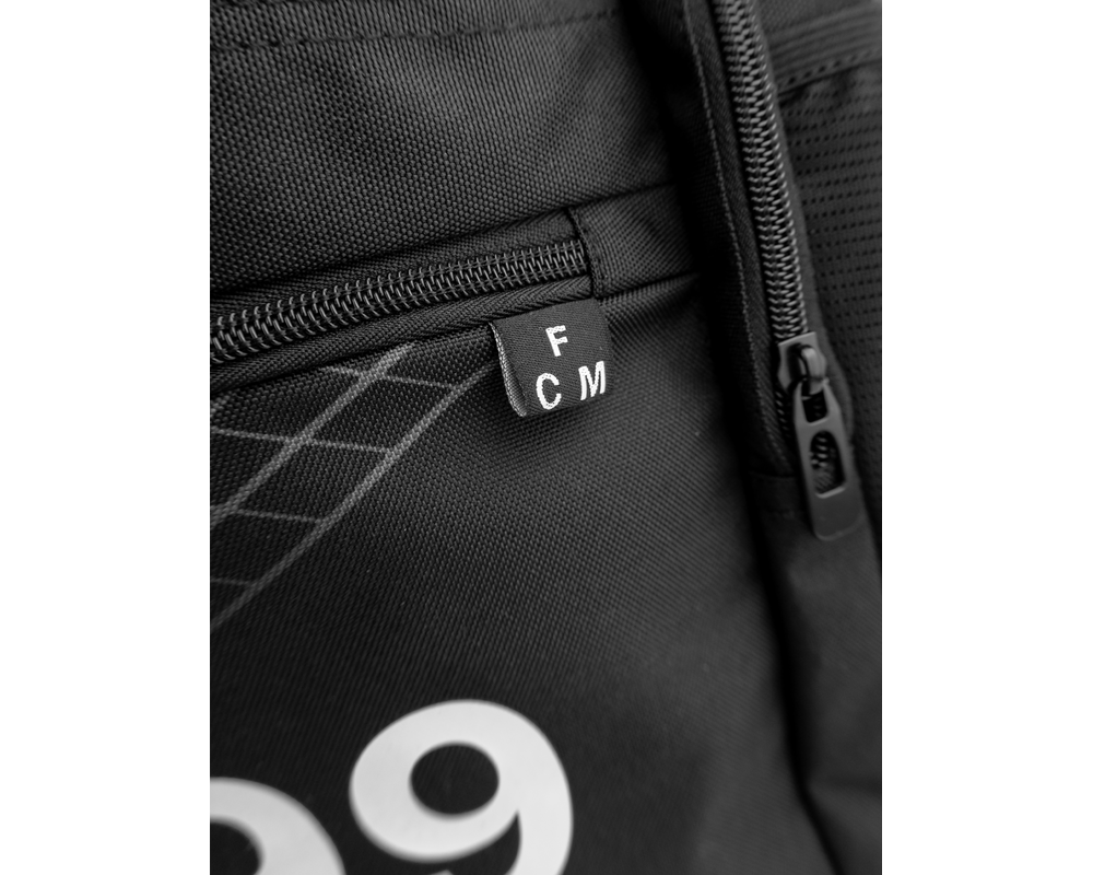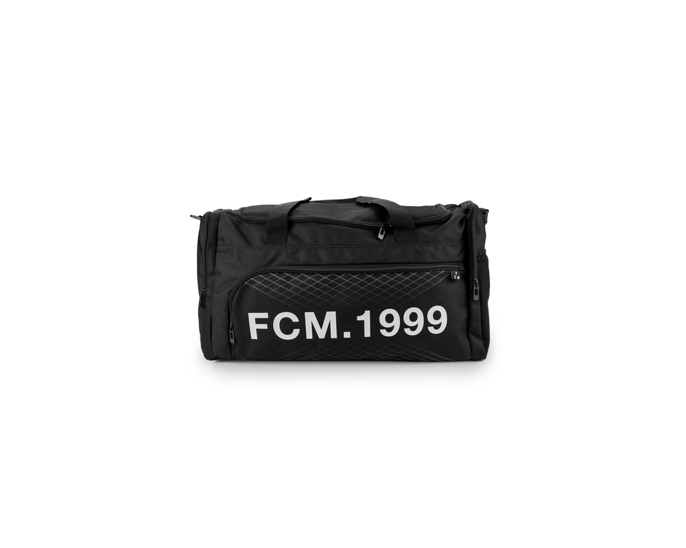 Robust og stilfuld sort sportstaske designet til både hverdag og sport. Tasken har rummelige sidelommer og en praktisk frontlomme til nem opbevaring af dine ting. På den ene side finder du det ikoniske F.C. Midtjylland-logo, og på den anden står "FCM. 1999". Perfekt til træning, weekendture eller som en del af dit FCM-gear!