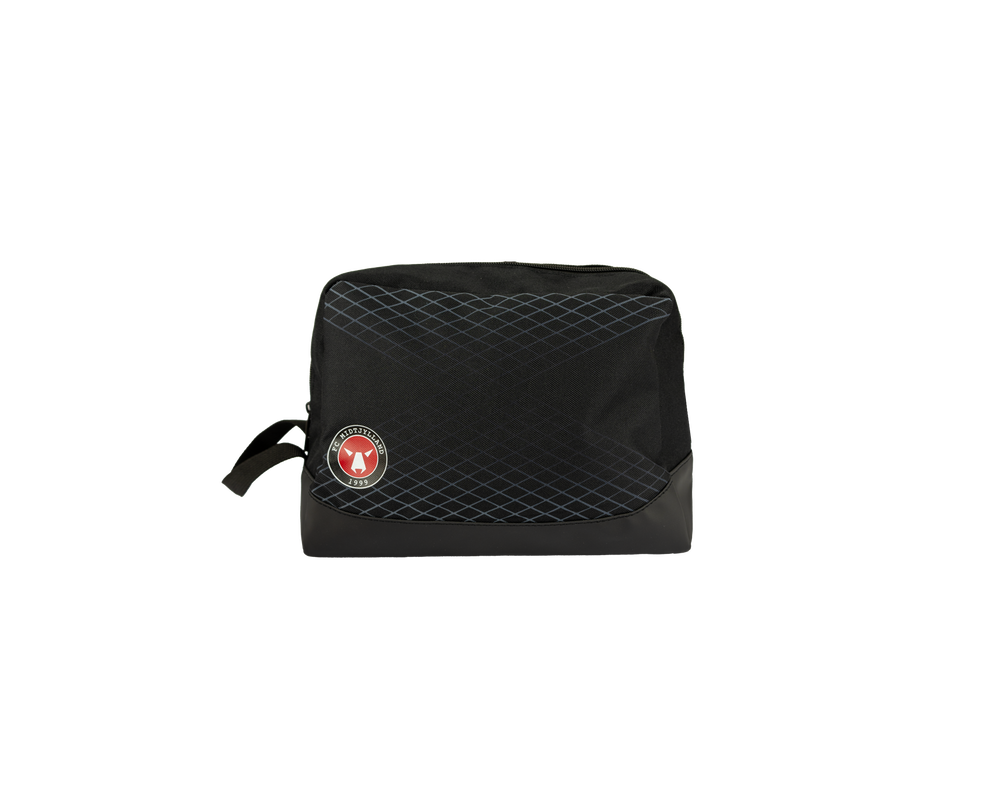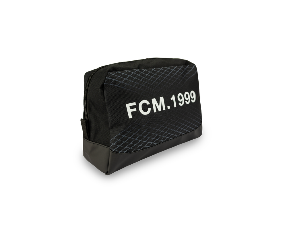Praktisk sort toilettaske med F.C. Midtjylland-logo på den ene side og "FCM. 1999" på den anden. Tasken har lynlås og en lille hank, der gør den nem at tage med på farten. Perfekt til både hverdag og rejser!
