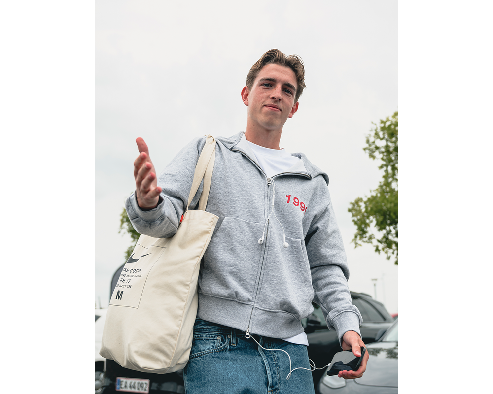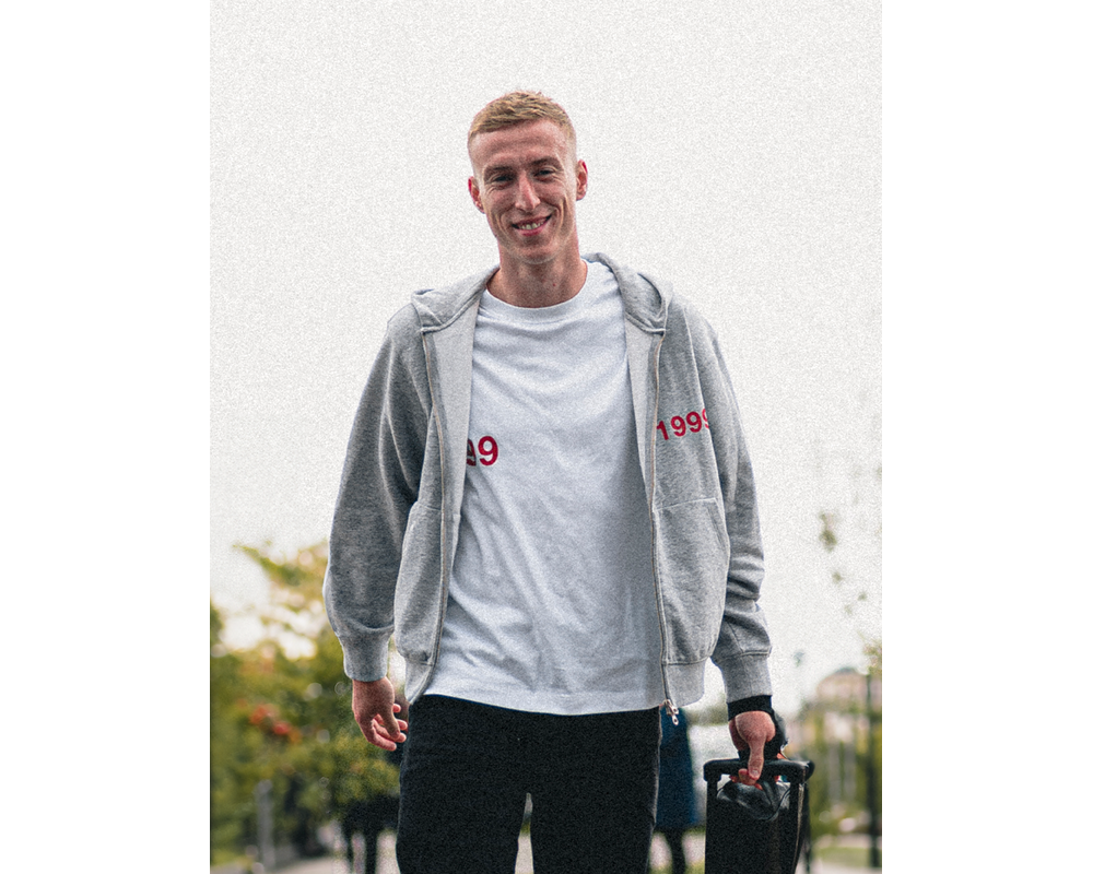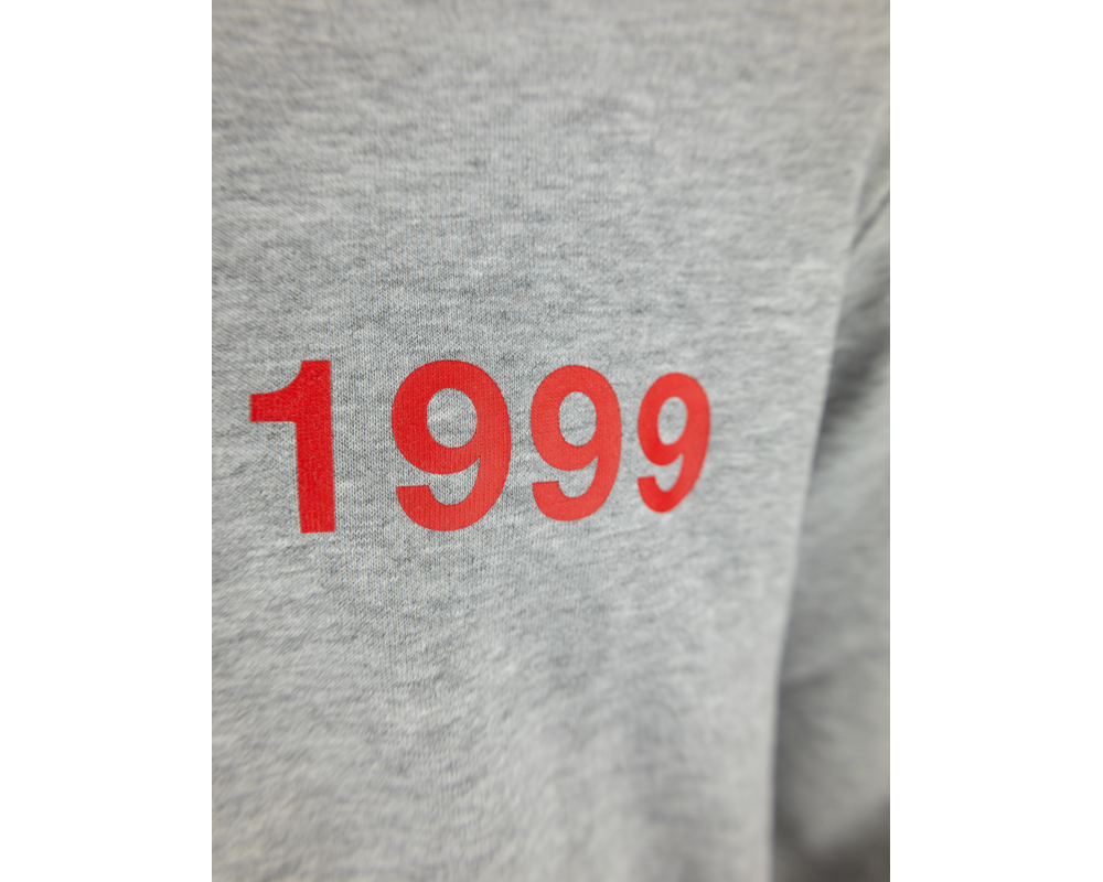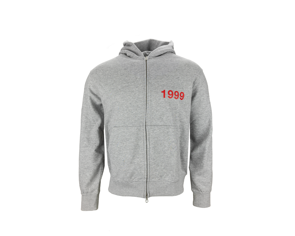 Lys grå hættetrøje med lynlås og '1999' trykt på brystet samt FCM på ryggen. Denne hættetrøje kombinerer stil og komfort med sit moderne design, perfekt til både afslapning og hverdagsbrug.