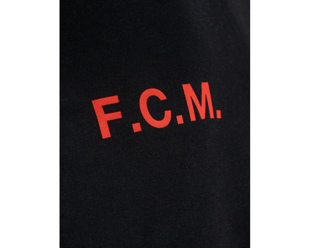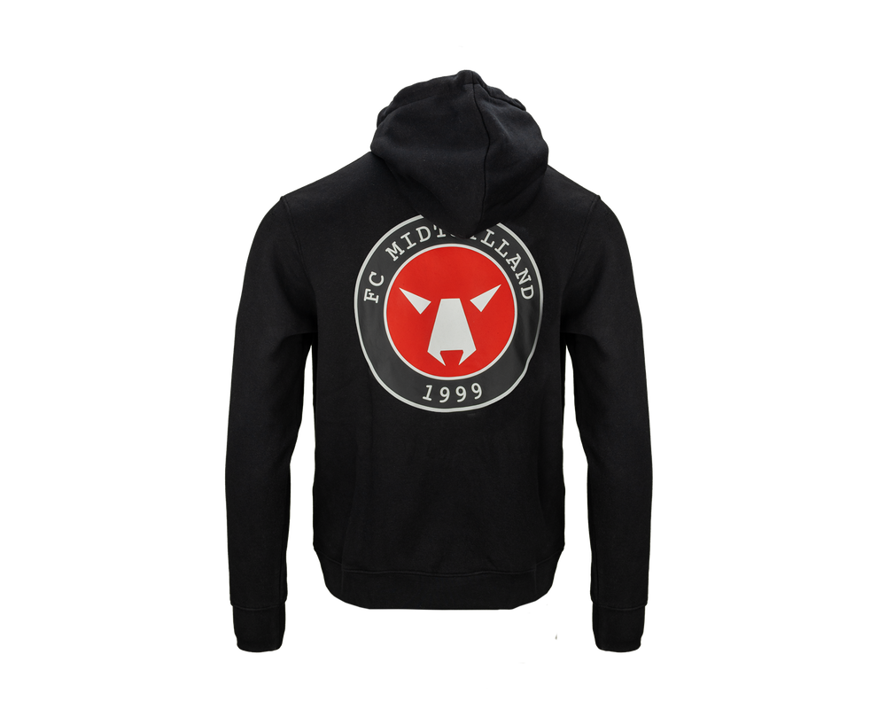 Sort hoodie med rød F.C.M. tekst på højre side af brystet og FC MIDTJYLLAND EST. 1999 på venstre side. Trøjen er designet med et stort FC Midtjylland logo på ryggen, så du til enhver tid kan vise din støtte til holdet, både til kampe og i hverdagen.