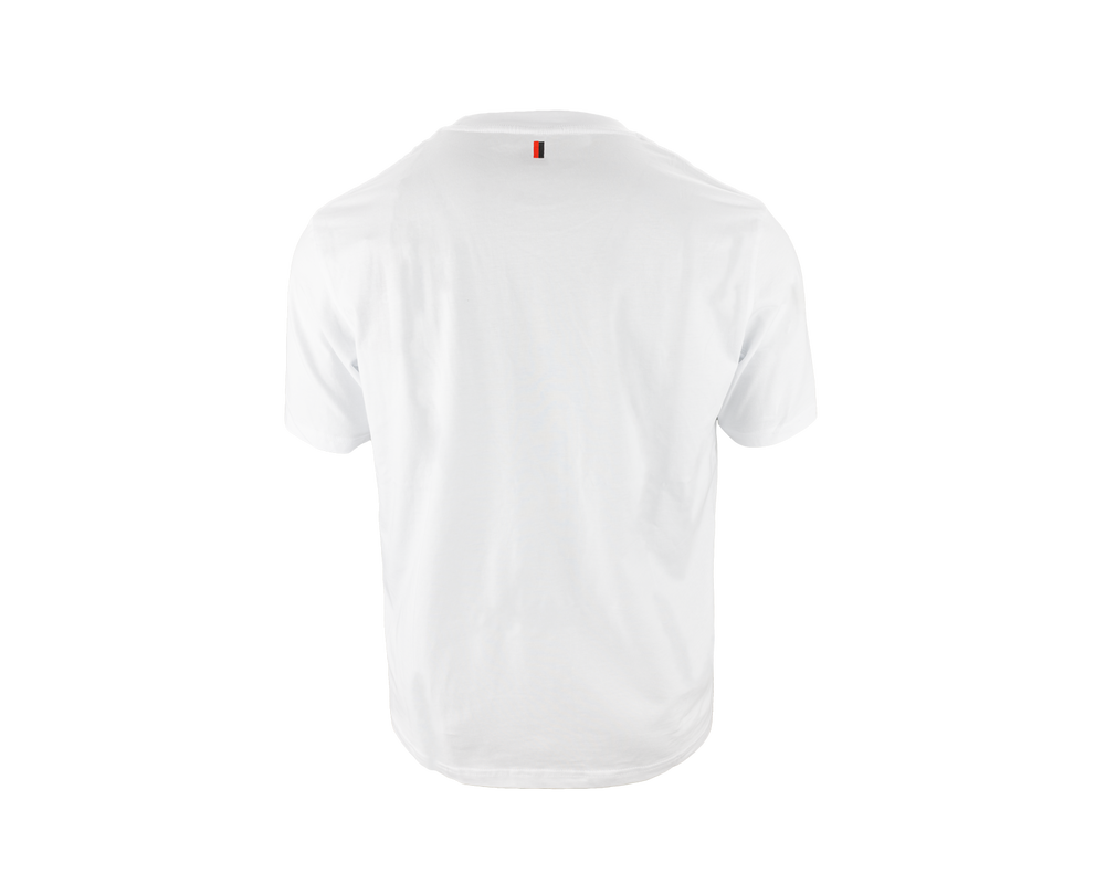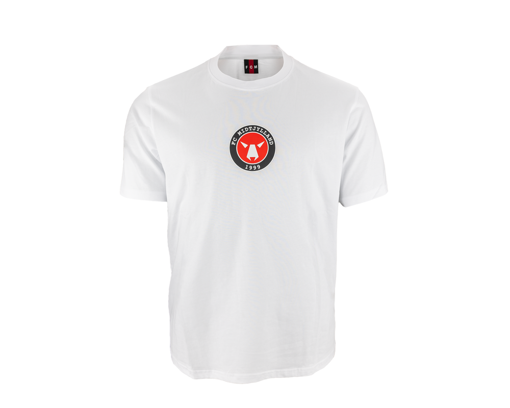 Hvid t-shirt med FCM-logo foran, der kombinerer enkelhed med klubstolthed. Perfekt til at vise din støtte til FC Midtjylland, tilbyder denne t-shirt både stil og komfort til enhver lejlighed.