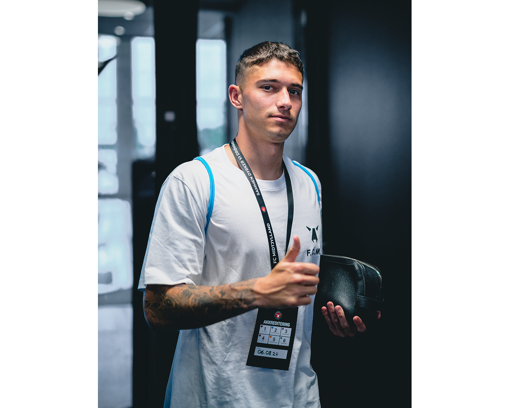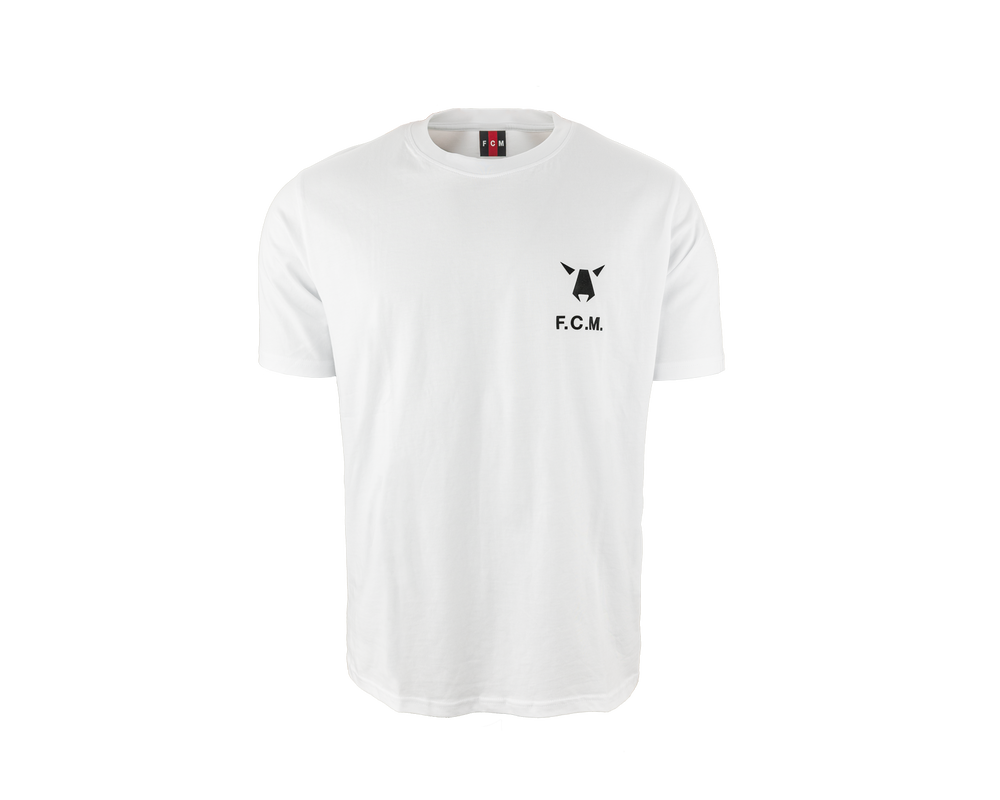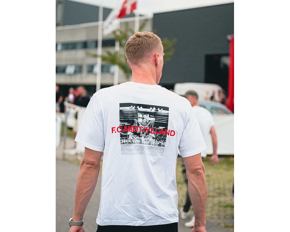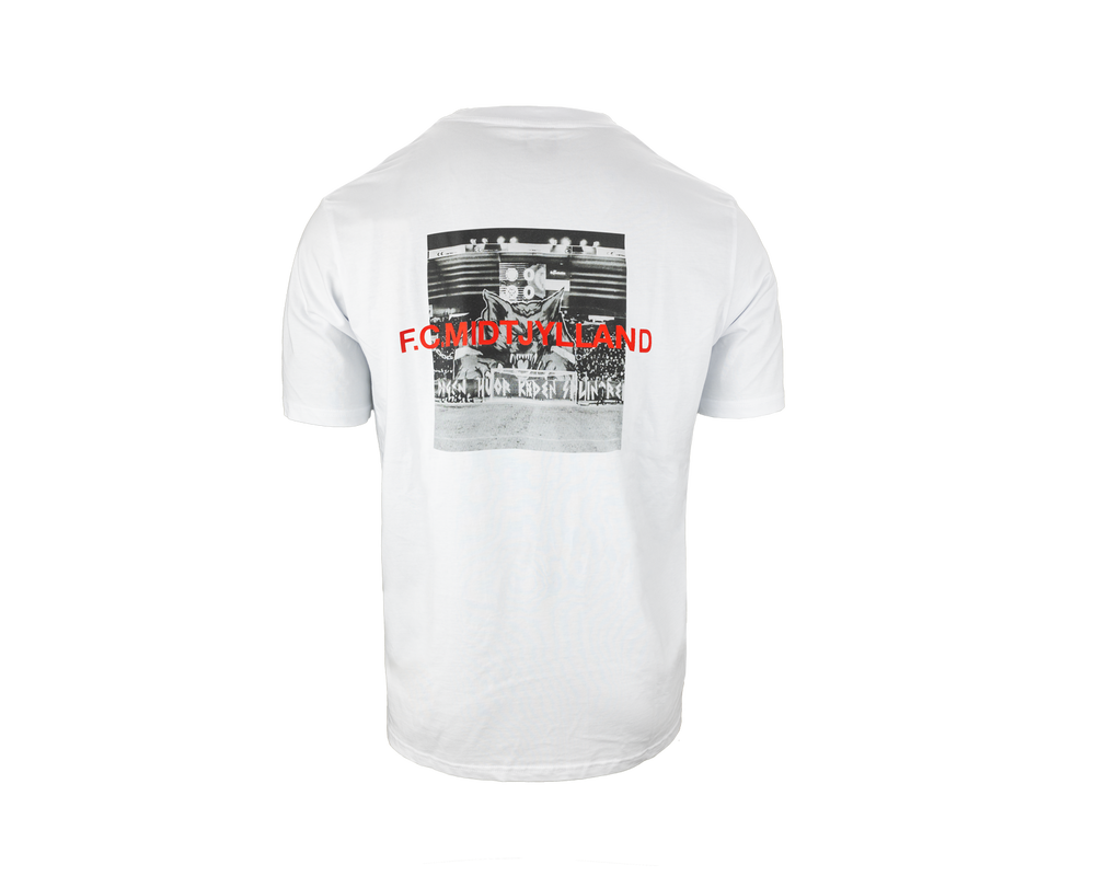 Hvid t-shirt der er designet med det ikoniske ulvehovede med teksten F.C.M under, på hø'jre side af fronten. Bagsiden er prydet med et stemningsbillede fra MCH Arena, samt teksten FC Midtjylland i en rød farve henover.