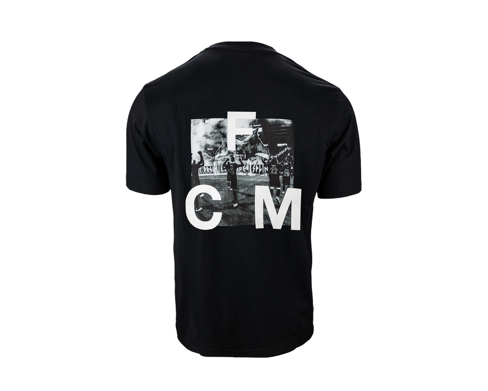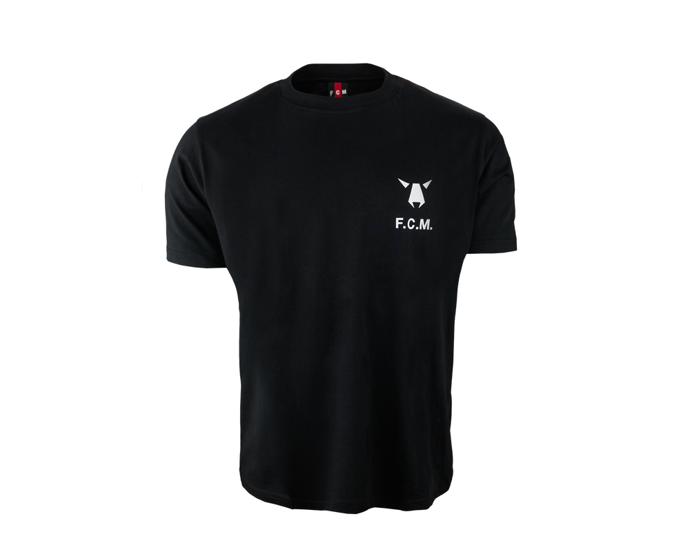 Sort t-shirt der er designet med det ikoniske ulvehovede med teksten F.C.M under, på hø'jre side af fronten. Bagsiden er prydet med et stemningsbillede fra MCH Arena, samt bogstaverne F C M henover.