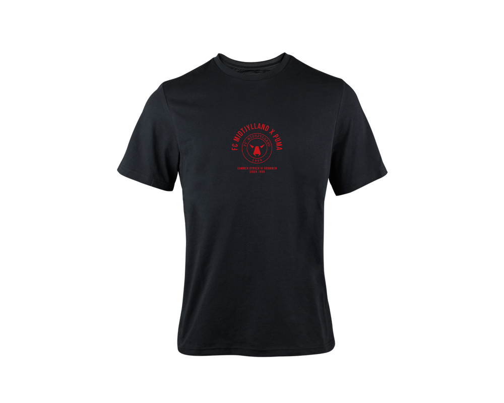 Denne t-shirt er lavet af en behagelig og blød bomuldsblanding med komforten i højsædet. T-shirten er lavet af en klassisk sort t-shirt med en rund hals og det enkle og stilrene design gør du kan bruge denne t-shirt til enhver lejlighed. Denne specifikke variant kommer med et lækkert design i rød farve med teksten FC MIDTJYLLAND X PUMA og ”Sammen dyrker vi drømmen siden 1999”.