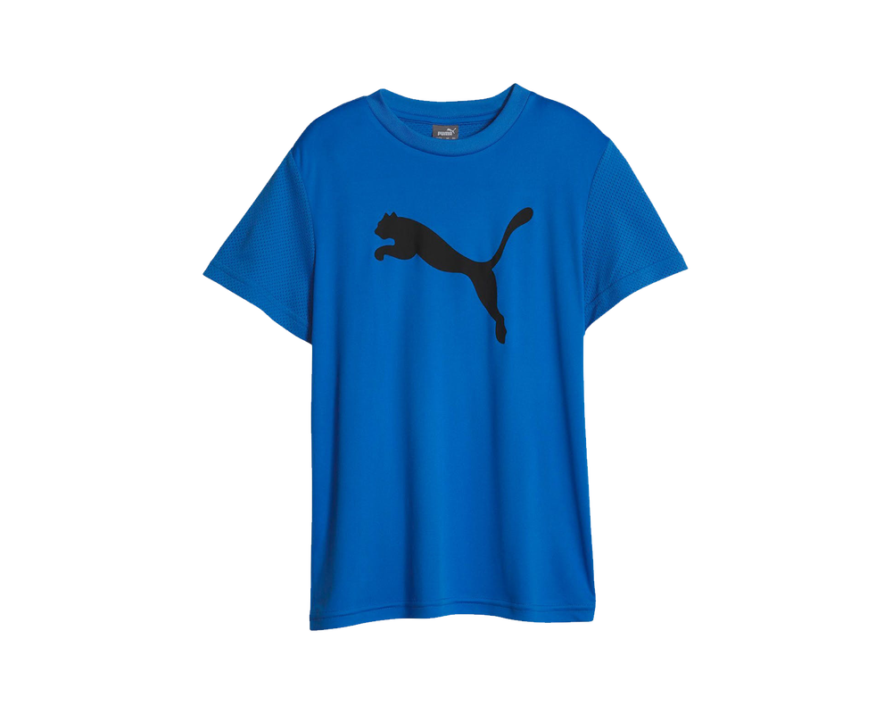 Denne t-shirt er en del af Puma Active Sports-kollektionen til børn. T-shirten kombinerer teknologi og sport, og fremstår stilfuldt i designet. T-shirten er fremstillet af 70% genbrugsmateriale, med fede detaljer som crewneck fit, Puma logo, en frisk blå farve og normal pasform.