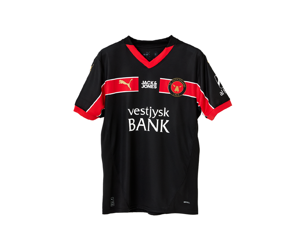 Hjemmebanetrøjen 24/25 kommer i et stilrent design med de klassiske FC Midtjylland farver og har stærke forbindelser til den første spillertrøje fra 1999. Den er således en Jubilæumstrøje med hyldest til rødderne fra FC Midtjyllands opstart, og en perfekt måde at fejre klubbens 25 års jubilæum.