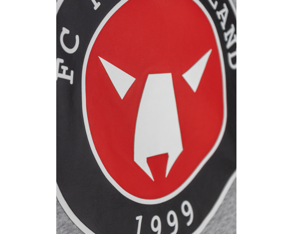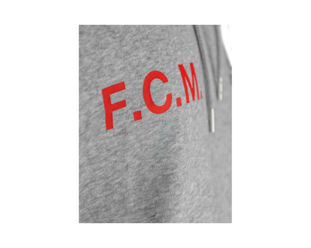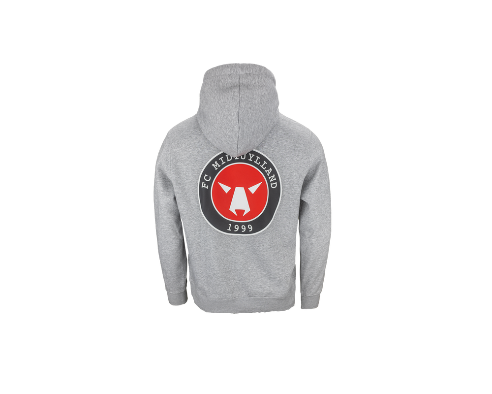 Grå hoodie med rød F.C.M. tekst på højre side af brystet og FC MIDTJYLLAND EST. 1999 på venstre side. Trøjen er designet med et stort FC Midtjylland logo på ryggen, så du til enhver tid kan vise din støtte til holdet, både til kampe og i hverdagen.