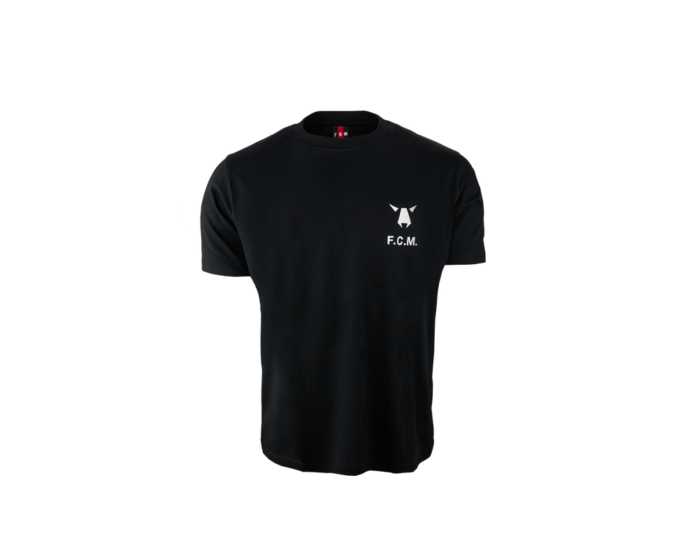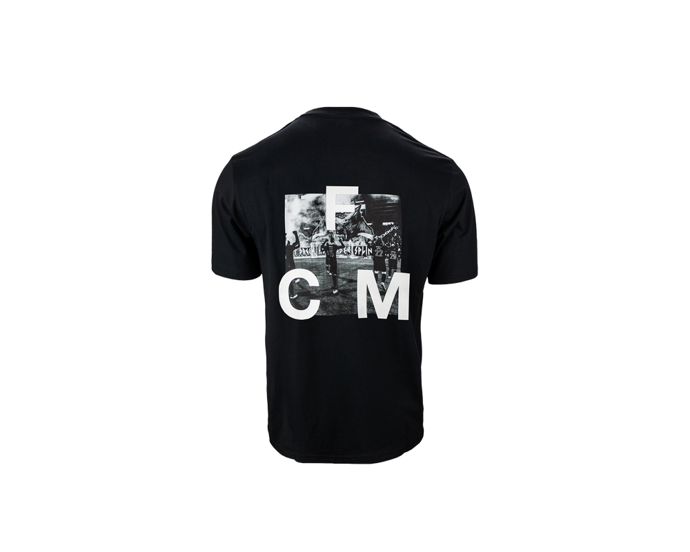 Sort t-shirt der er designet med det ikoniske ulvehovede med teksten F.C.M under, på hø'jre side af fronten. Bagsiden er prydet med et stemningsbillede fra MCH Arena, samt bogstaverne F C M henover.