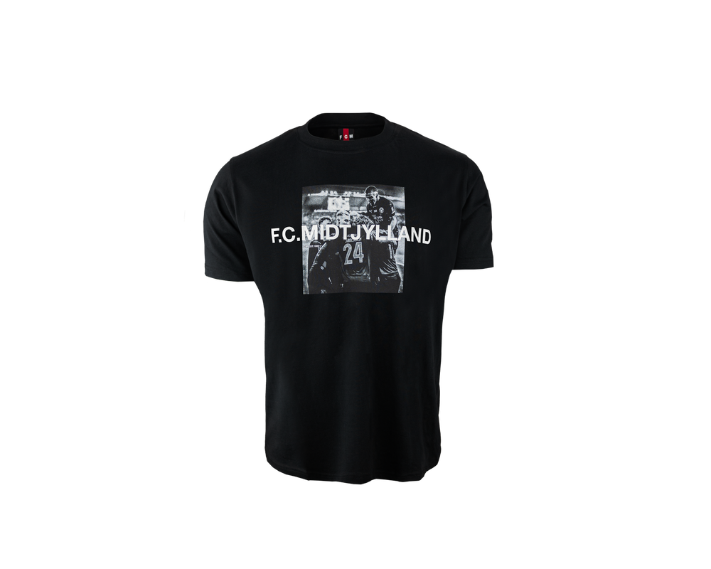 FC Midtjylland t.-shirt designet med et billede centreret på brystet af jublende FC Midtjylland spillere, med teksten F.C. Midtjylland henover, som tilsammen skaber en lækker t-shirt. Nakkedetalje med FC Midtjylland officielle sorte og røde farve.
