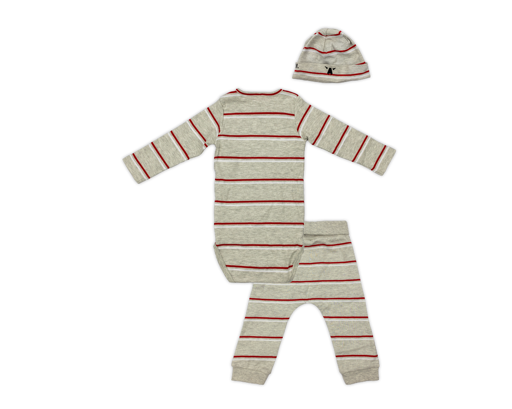 Forkæl de mindste FCM-fans med dette søde bodyset i lys grå. Sættet indeholder en body, matchende bukser og en lille hat, som sammen skaber et perfekt outfit. De hvide og røde striber giver et sporty udtryk, og FCM logoet på brystet kombineret med en lille ulv på body og bukser tilføjer sjov og personlighed. Lavet i blødt og behageligt materiale, der sikrer optimal komfort for din baby, både til leg og afslapning. En ideel gave til nye FCM-fans!