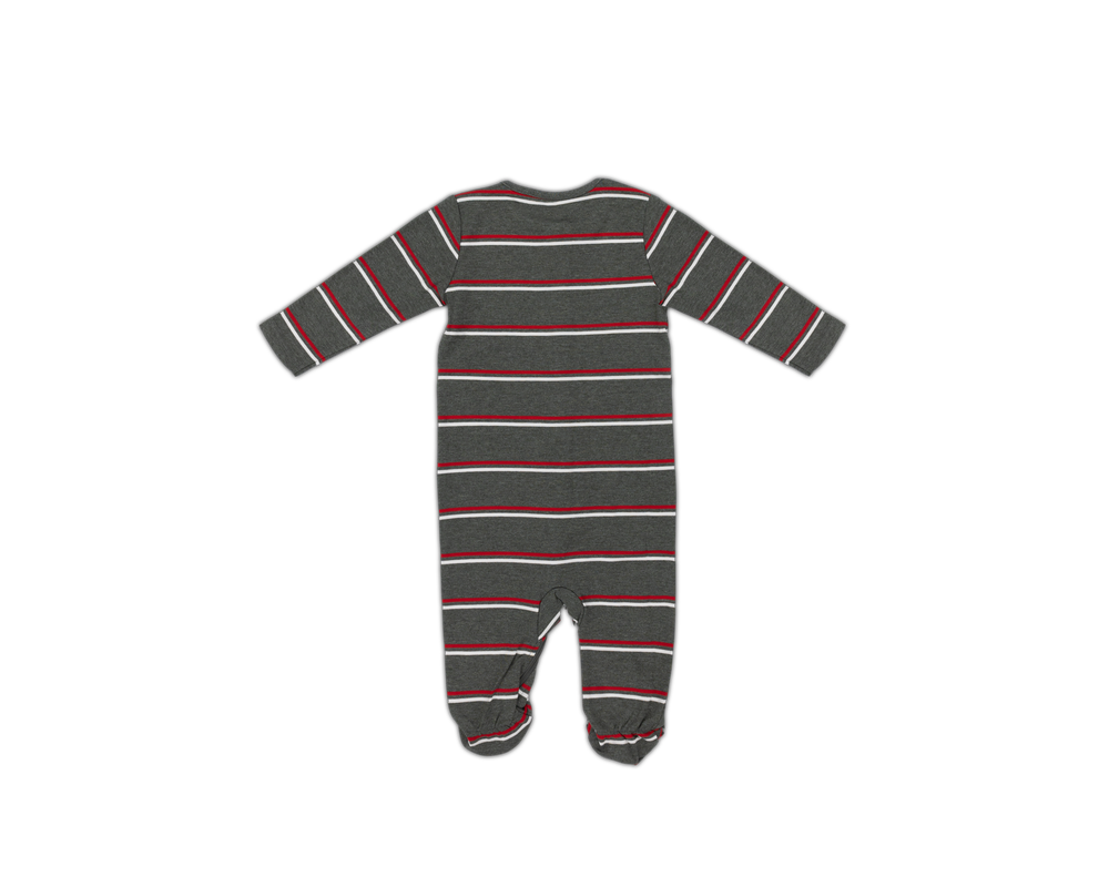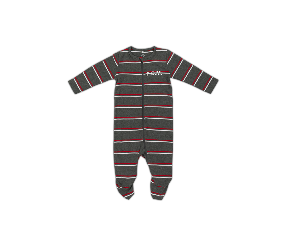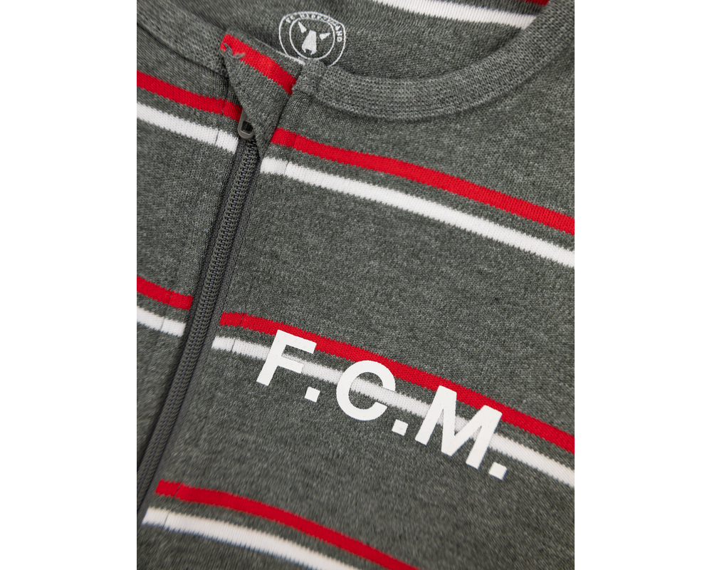 Klar til kamp eller leg med denne mørkegrå bodysuit til de mindste FCM-fans. heldragten har både lange ærmer og lange bukser, hvilket gør den perfekt til de køligere dage. De røde og hvide striber giver et sporty look, mens F.C.M. logoet på brystet i hvidt tilføjer en flot kontrast og understreger klubbens stolthed. Fremstillet i blødt materiale, der sikrer komfort hele dagen. Et praktisk og stilfuldt valg til babyer, der vil vise deres støtte til FCM fra start.