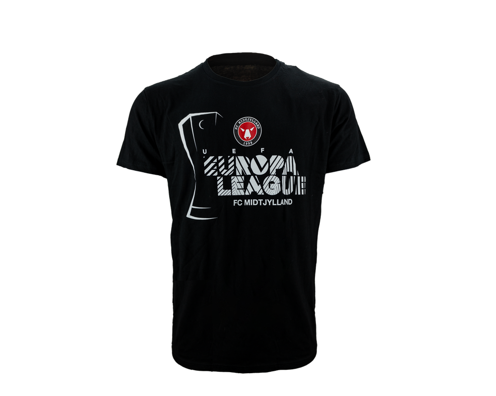 En lækker sort t-shirt med Europa League og FC Midtjylland grafik på fronten. Denne t-shirt er en del af den officielle FC Midtjylland Europa League 2024/25 kollektion.
